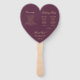 Um fã do programa de casamento em forma de coração simples, mas elegante, com a cor do vinho. Os títulos e os nomes (e as iniciais) da noiva e do noivo são escritos em uma escrita elegante, o restante em bonés. O fundo tem a cor do vinho (perto de burgundy), o texto é ouro. No verso, tem no lado esquerdo o programa da cerimônia de casamento e, no lado direito, a festa de casamento (com 2 colunas diferentes para a equipe da noiva e do noivo). e sob eles uma pequena mensagem de agradecimento.