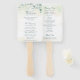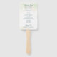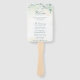 Ventilador de mão do programa de casamento elegante, com folhas de eucalipto e verde, com uma dica de azul e manchas de brilho falsa de ouro, sobre uma lavagem a aquarela pastel. Seus detalhes estão em verde-escuro com os eventos da cerimônia na frente e a festa de casamento e o obrigado que você envia no verso. Esta simples e rústica design é excelente para um casamento de temas botânicos no verão.