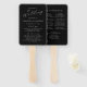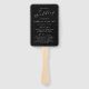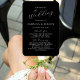 Este elegante e moderno fã do programa de casamento mostra um texto branco sobre um fundo preto. Os títulos e legendas aparecem em lindos scripts de caligrafia, com os nomes dos casais em serif e o texto restante em sans serif font.