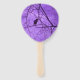 Este leque de mão de programa tem uma silhueta de um único corvo preto sentado nos galhos de árvores negras áridas contra um céu roxo enevoado na frente e atrás.