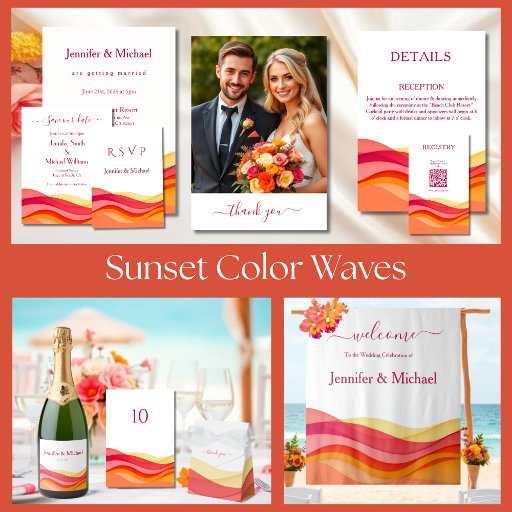 Coordinate with the full Sunset Color Waves wedding collection, including invitations, RSVP cards, details cards, registry cards, stickers, and décor, for a cohesive and unforgettable wedding experience from start to finish.
