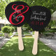 Fã de casamento de mão em cores preta, vermelha e branca. Nomes do casal em branco sobre preto com um grande sinal de "e" em vermelho. O ditado, "Ter e manter a partir deste dia" está nas costas juntamente com a data. Ventiladores em forma de oval são mostrados, com outras formas disponíveis.