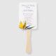 Programa de fãs retangulares com um design de flor de pássaro do paraíso. Escolha um papel branco ou um documento para personalizar com texto na frente e no verso. Os ventiladores serão colados juntos após a compra, ou você poderá pagar extra para que sejam pré-montados. O texto é púrpura escura com uma imagem de flor tropical amarela solteiro no fundo.