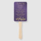 Elegante fã formal do programa de casamento feito em uma aparência brilhante brilhante violeta de tendências, com gráficos de uma decoração de ouro florescente, na parte inferior. Personalize o texto, em ambos os lados do fã, para o dia do seu casamento.