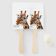 Zoo tematizou o remo do número do leilão e a ventoinha feita em branco com uma fotografia de uma cabeça de girafa. Personalize o texto marrom do seu evento. Escreva manualmente o número para cada pá, na parte superior.