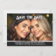 Um modelo de fotografia simples, mas elegante tem modelos brancas ricos em negrito ao longo da borda superior (com uma sombra de gota) e dois outros na parte inferior colocados contra uma banda horizontal preta que tem uma borda prateada falsa. Personalize o modelo com sua própria foto especial do casal de noiva e personalize o texto para se adequar às suas necessidades especiais de casamento. A design é adequada a casamentos, chás de panela, aniversários de casamento e eventos corporativos.