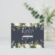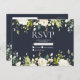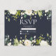 Este cartão postal de cor branca floral brilhante e romântica, cor d'água, RSVP apresenta uma sumptuosa gota verde no topo, composta por uma bela coleção de verde eucalipto e rosas brancas, hífenes e outras flores brancas. Uma disposição semelhante é colocada na parte inferior da design e atrás, e o elegante texto de convite ao estilo moderno personaliza o design no meio, com o elegante tipo branco numa textura azul-marinho moderna. Nenhum menu incluído nesta versão. Parte de um jogo de casamento. Convidados Elegantes de Direitos Autorais. Todos os direitos reservados.
