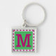 A letra maiúscula "M" é feita em cor fuchsia sobre um fundo verde brilhante. A borda pega na cor da fúcsia da letra e tem um design em forma de diamante ao redor da borda em fúcsia e branco.