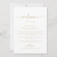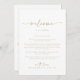 Esta carta de boas-vindas do casamento elegante e moderno é perfeita para um casamento rústico. O design simples e elegante apresenta a tipografia clássica, dourada e escrita de rico. Personalize a frente com uma mensagem de boas-vindas para seus convidados e seus nomes. Personalize as costas com a programação de eventos e outras informações úteis.