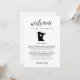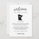 Compartilhe uma mensagem de boas-vindas para seus convidados de casamento em Minnesota, assim como um itinerário ou agenda dos eventos do fim de semana. Front mostra sua mensagem de boas vindas com um mapa da silhueta do estado de Minnesota com um dentro do coração. Personalize o reverso com o dia do casamento ou o itinerário do fim de semana do casamento. Perfeito por incluir nas bolsas de boas-vindas do hotel ou entregar aos quartos dos seus convidados.