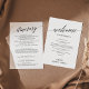 Esta elegante carta de boas-vindas e cartas itinerárias são perfeitas para um casamento simples. A design neutra apresenta uma carta minimalista decorada com tipografia romântica e caprichosa. A frente da carta apresenta uma carta de boas-vindas e a parte de trás da carta apresenta o itinerário do casamento. Estas notas são perfeitas para casamentos de destino e bolsas de boas-vindas de hóspedes.