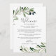 Estas cartas de boas-vindas e cartas itinerárias são perfeitas para um casamento de boho. O design rústico, porém elegante, apresenta folhas botânicas de cor aquática simples e azeitonas pretas num pequeno galho com um toque mediterrânico clássico. A frente da carta apresenta uma carta de boas-vindas e a parte de trás da carta apresenta o itinerário do casamento. Estas notas são perfeitas para casamentos de destino e bolsas de boas-vindas de hóspedes.