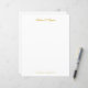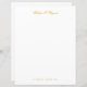 Escrito em ouro elegante papel de papel de carta personalizado com monograma. Parte superior frontal - nome em texto dourado, parte inferior frontal - linha de endereço em texto simples. Fundo traseiro - monograma de script.