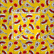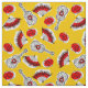 Design lunático seleccionado em um estilo retro que caracteriza lembranças de um feriado espanhol; uma guitarra do ferro forjado, um fã laçado e uma rosa vermelha. Um design customizável no amarelo preto, branco, vermelho e dourado para que você personalize com seus próprios texto, imagens e ideias. Uma imagem digital original da arte.