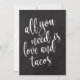 Um letreiro de casamento elegante e moderno, com o texto "Tudo o que você precisa é amor e tacos" em uma fonte de letra extrovertida, a textura da pincelada adiciona um sentimento espontâneo e divertido. A cor do fundo pode ser personalizada de acordo com as suas necessidades e preferências, por favor entre em contato se tiver algum pedido especial.