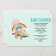 Convite para chá de fraldas com uma ilustração com uma preguiça marrom giratória que pairava alegremente num galho de árvore. Um arco-íris colorido atrás dele junto com um sol rosa pairando sobre a cabeça. Bonita, adorável e moda.