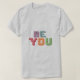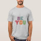 A t-shirt apresenta o texto "Be You" numa fonte arrojada e chamadora de olhos que aparece de forma destacada na frente. O texto poderia ser centrado ou colocado fora do centro para uma aparência mais dinâmica. A cor do texto pode ser uma única cor sólida ou uma combinação de cores para criar uma instrução. O design da t-shirt incorpora o texto "Seja você" de uma forma criativa e lúdica. As letras podem ser projetadas individualmente com fontes, cores ou gráficos exclusivos. A parte "Be" poderia ser escrita em um estilo diferente de "You" para adicionar ênfase. Também poderiam existir elementos adicionais na camisa que complementam o tema da individualidade, como espirais, platters ou pequenas ilustrações.