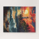Esta quebra-cabeça apresenta uma ilustração vibrante de um farol vermelho e branco sentado num penhasco oceânico enquanto o céu queima um vermelho brilhante com um pôr do sol. Ondas brancas e lacrimejantes caem em direção a uma costa castanha rochosa.
