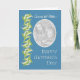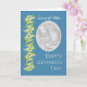 Uma placa de Dia de as mães bonito "Across the Miles" para personalizar com sua própria foto, assim como a mensagem dentro. O padrão dos lírios do Vale em fundo azul é da coleção Posh & Painterly, 'For the Love of Lily'.