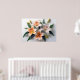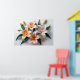 Poster de lírios elegantes em tons macios de laranja e branco dispostos com folhas verdes vibrantes sobre fundo leve. As pétalas detalhadas e os estame acrescentam um toque realista à composição floral.