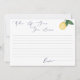 Cartões de chá de panela com o título "quando a vida dá seus limões" em marinho de letra de caligrafia moderna e um limão de aquarela solteiro com folhas. Inclui linhas de guia de cinza e sinal de "amor" desativado. O reverso apresenta um fundo azul marinho com um padrão de limões e folhas de aquarelas.