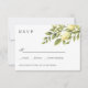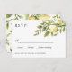 Projetada para coordenar com nossa coleção de casamento floral de Lemons e Leaves aquáticas, esta elegante placa RSVP botânica apresenta uma sofisticada faixa de aquarela de limões e folhas amarelas no lado superior direito da carta com sua resposta e data desejadas. Cartões invertem para um padrão coordenado de limões em fundo branco. Um design moderno e clássico para casamentos chic elegantes para qualquer estação.