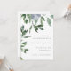 Este convite de casamento botânico moderno e mínimo apresenta um belo verde-aquarela e uma simples flor azul empoeirada.