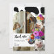 Cartão de agradecimento de aniversário com tema de vaca sagrada. O design apresenta um fundo com estampa de vaca em preto e branco, um arco de foto branco, duas vacas fofas com adornos florais coloridos e vibrantes em aquarela e uma divertida mensagem de agradecimento da vaca.
