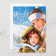 Parece tão bonito! O jovem casal romântico vestido com pesados casacos de inverno, luvas e chapéus aproveitando o tempo frio e a neve caindo sobre as montanhas, árvores e lago. Você pode alterar o texto conforme desejar.