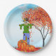 Este prato de papel do outono foi criado com camadas de uma variedade de gráficos da estação. O espantalho e as abóboras são sobrepostos em uma paisagem com folhas de outono em uma árvore carvalho. Um girassol foi adicionado ao chapéu do espantalho, e folhas laranjas seguidas por duas grandes abóboras. Este prato de papel vem em dois tamanhos, escolha o tamanho que atende às suas necessidades. Qualquer um vai gostar deste prato de papel, perfeito para reuniões de outono, bazar da igreja ou festa infantil.