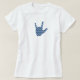 Este t-shirt caracteriza o sinal para "eu te amo" em ASL (linguagem gestual americano) enchido com um teste padrão moderno da viga no marinho e na luz - azul.