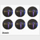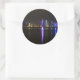 Um adesivo fotográfico redondo dos arranha-céus iluminados na linha do horizonte do centro comercial de Doha, a capital do país do Golfo Árabe, Qatar, à noite.