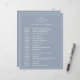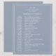 Linha do tempo simples de casamento com um design moderno, mas elegante, com seu monograma de duas letras no topo e seus detalhes cercados por uma fina fronteira. Todo o texto está branco sobre um fundo azul empoeirado e pode ser alterado para qualquer cor desejada clicando no botão "personalizar". Um design chic e na moda que é excelente para um casal minimalista.