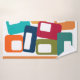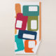 Este conjunto de toalhas tem uma toalha de banho com um design moderno do século médio de linhas e retângulos em tons retrorados de laranja, ouro, amora, chaleira, verde, azul, turquesa, e verde, um pano de lavagem laranja e uma toalha azul.