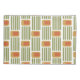 Este travesseiro tem um design moderno século médio feito de cinco linhas verdes e um retângulo dourado arredondado com um retângulo laranja arredondado repetido na design.