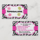 Este é um cartão de visita adorável. Tem listras preto e branco da zebra com uma fita das bolinhas do rosa quente que vem através do centro do cartão. Há um centro borbulhado branco com as quatro flores pequenas nos cantos do centro branco. Verifique para fora os muitos outros produtos com este design.