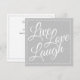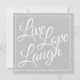 Perfeito para ter várias em mãos para estar sempre pronto para enviar suas saudações, pois às vezes é preciso ter um cartão geral para enviar uma mensagem ou saudações. Clássico e elegante e envia uma bela mensagem inspiradora - Live Love Laugh. Adicione sua própria mensagem no verso ou escreva cada mensagem manualmente mais tarde. Escrito branco elegante em cinzas de prata clássicas. Envie-me um e-mail se você ajudar a fazer deste cartão mais pessoal ou se você precisar de ajuda para transferi-lo para outro produto e eu gostaria de ajudar. designsbykatz@gmail.com
