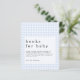 Um alternativo de 4,5 pol x 5,6 pol com preço inferior. O SATIN FINISH 80 lb É UM STOCK DE PAPEL MAIS FINO (ideal para gabinetes), ou Disponível em um STOCK SEMI GLOSS 110 lb CARD (ideal para convites). Os envelopes são um extra opcional e são ligeiramente maiores que o tamanho da placa. Livros Azuis de Gingham para Recinto de Bebê. Garoto Bebê. O cabeçalho é grande em na moda em minúsculas, com os detalhes na parte inferior de uma camada de opacidade sobreposta ao fundo de gingham. Personalize facilmente o texto para seus próprios detalhes.