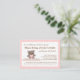 Um poema encantador solicita que os convidados tragam um livro para o futuro bebê para começar a nova mãe com uma biblioteca de livros infantis amados. Basta inserir este doce cartão no envelope com os convites ao chá de fraldas. O adorável esquema cor-de-rosa e branco com um ursinho bonito lendo um livro faz um design perfeito para coordenar com praticamente qualquer convite para uma chá de fraldas.