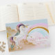Livro convidado da festa de aniversário Unicórn com bonito unicórnio pastel num arco-íris e nuvem de ouro. Este belo livro convidado unicórnio é facilmente personalizado para o seu evento simplesmente adicionando o texto de sua escolha no estilo de fonte que você prefere. Você também pode mudar a cor de fundo neste adorável livro convidado de festa de aniversário unicórn. Este é um design impresso sem brilho real.