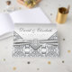 Elegante livro convidado de aniversário de 25 do casamento de prata com fita de diamante prateado em um lindo fundo de renda prateada. Este belo livro de convidados da festa de aniversário de 25 prateado é facilmente personalizado para o seu evento simplesmente adicionando os seus detalhes no estilo de letra da sua escolha.