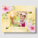 Para uma festa de aniversário de verão 100. Fundo amarelo, branco com um padrão de mel. Decorados com flores tropicais cor-de-rosa, hibisco e abelhões felizes. Adicione sua própria foto e os 100 anos. Letras verdes e coloridas. Coloque seu próprio texto. Volta: padrão honecomb e uma abelha feliz.