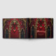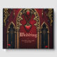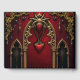 Amor eterno nas sombras da escuridão, no estilo gótico. O ponto focal é um arco gótico majestoso decorado com detalhes delicados de ouro e brilhando sobre um fundo vermelho profundo. As duas colunas elegantes que flanqueam o arco-íris adicionam um toque sublime ao design e enfatizam o design opulente. O coração balançando suavemente do arco-íris desenhar o olho e é enquadrado por um efeito sanguíneo que goteja,