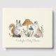 Este livro de hóspedes do chá de fraldas apresenta um tema adorável de animais florestais. Amigos e familiares podem adicionar seus pensamentos e desejos para a próxima mãe, pai e bebê. Que comece a aventura! Pequeno esquilo, raposa e cogumelos.