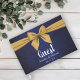 Fundo azul escuro impressionante amarrado com uma imagem de arco dourada. Papel de carta está todo impresso, sem fita verdadeira. Personalize nossa bela papelaria com seus detalhes de evento fácil e rapidamente, basta pressionar o botão personalizar. Está incluída a coordenação no verso. Itens correspondentes para concluir sua coleção de eventos estão disponíveis em nossa loja Zazzle!