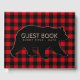 Livro de hóspedes da xadrez de búfalos com urso em fundo de xadrez de búfalos vermelho e preto. Você pode personalizar facilmente este livro de hóspedes de xadrez de búfalo rústico para seu evento simplesmente adicionando o texto de sua escolha no estilo de fonte que você prefere.