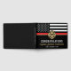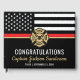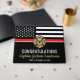 Este design apresenta uma bandeira de bombeiros com listras pretas e brancas, e uma fina faixa vermelha também. "Parabéns" e o crachá de bombeiro ficam acima do nome do bombeiro, tenente ou chefe graduado ou aposentado. Celebre em estilo!