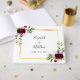 Na frente: Um moderno livro de hóspedes elegante decorado com rosas de cor d'água em burgundy com penas e verde. Com uma falsa armação de ouro. Modelos para seus nomes e data de casamento. Fundo branco. Os nomes na frente são escritos com um moderno e moderno estilo escrito à mão. Letras pretas coloridas. Coloque o texto nas letras do ouro da coluna. Fundo azul marinho. Fundo: fundo azul marinho.