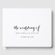 Este livro de hóspedes da caligrafia moderna é perfeito para um casamento rústico. O design simples e elegante apresenta a tipografia de scripts clássicos e ricos em preto e branco. Personalize o cobrir frontal e a coluna para incluir os nomes da noiva e do noivo e a data do casamento.