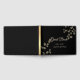 Folhas elegantes de ouro cólico no livro de convidados de casamento de fundo negro.